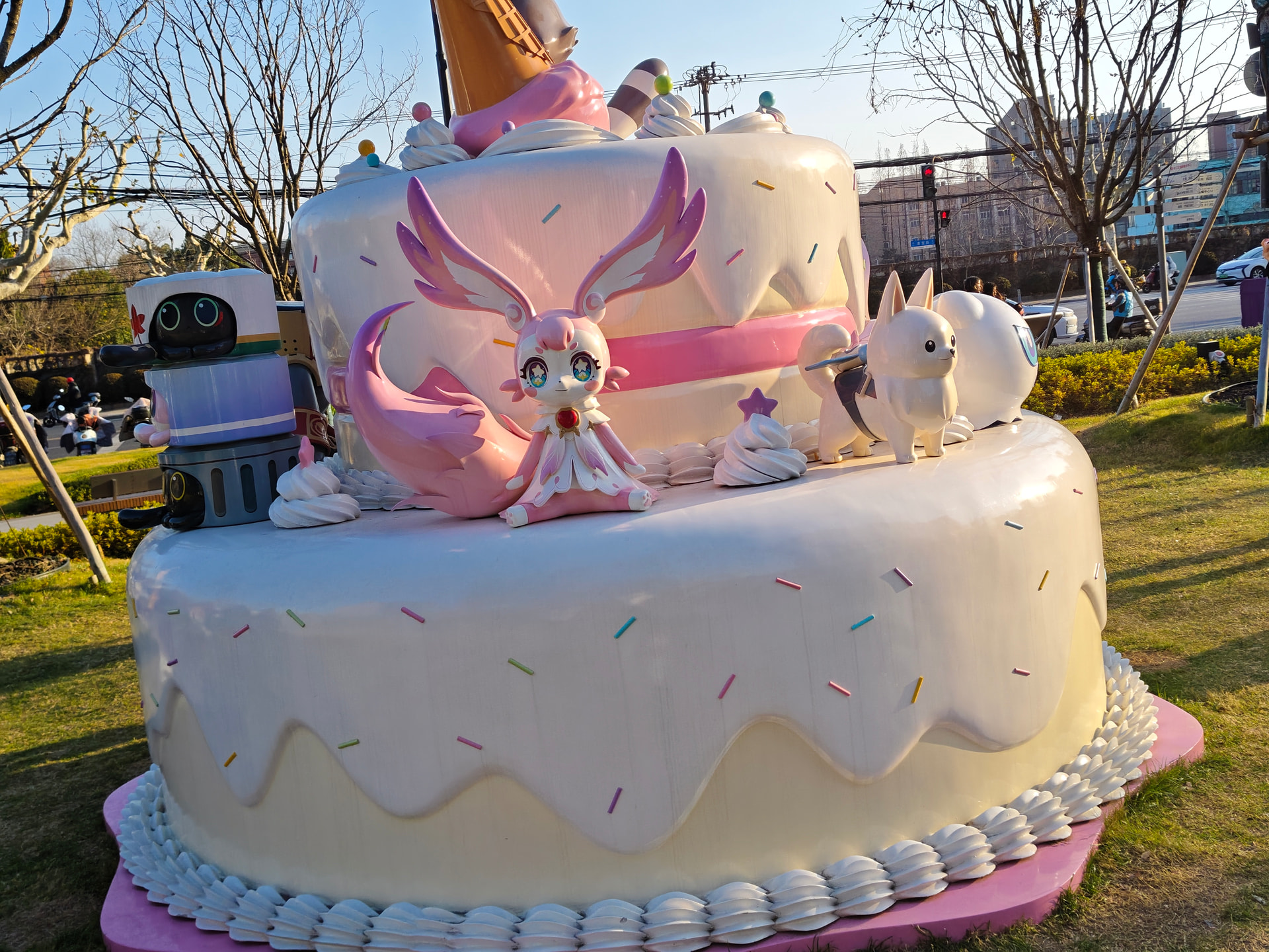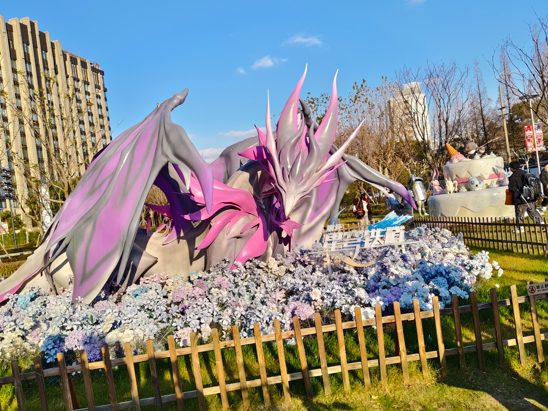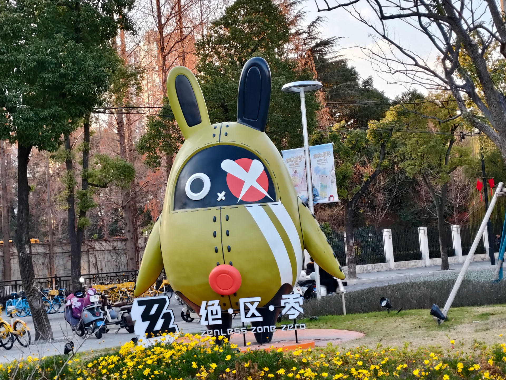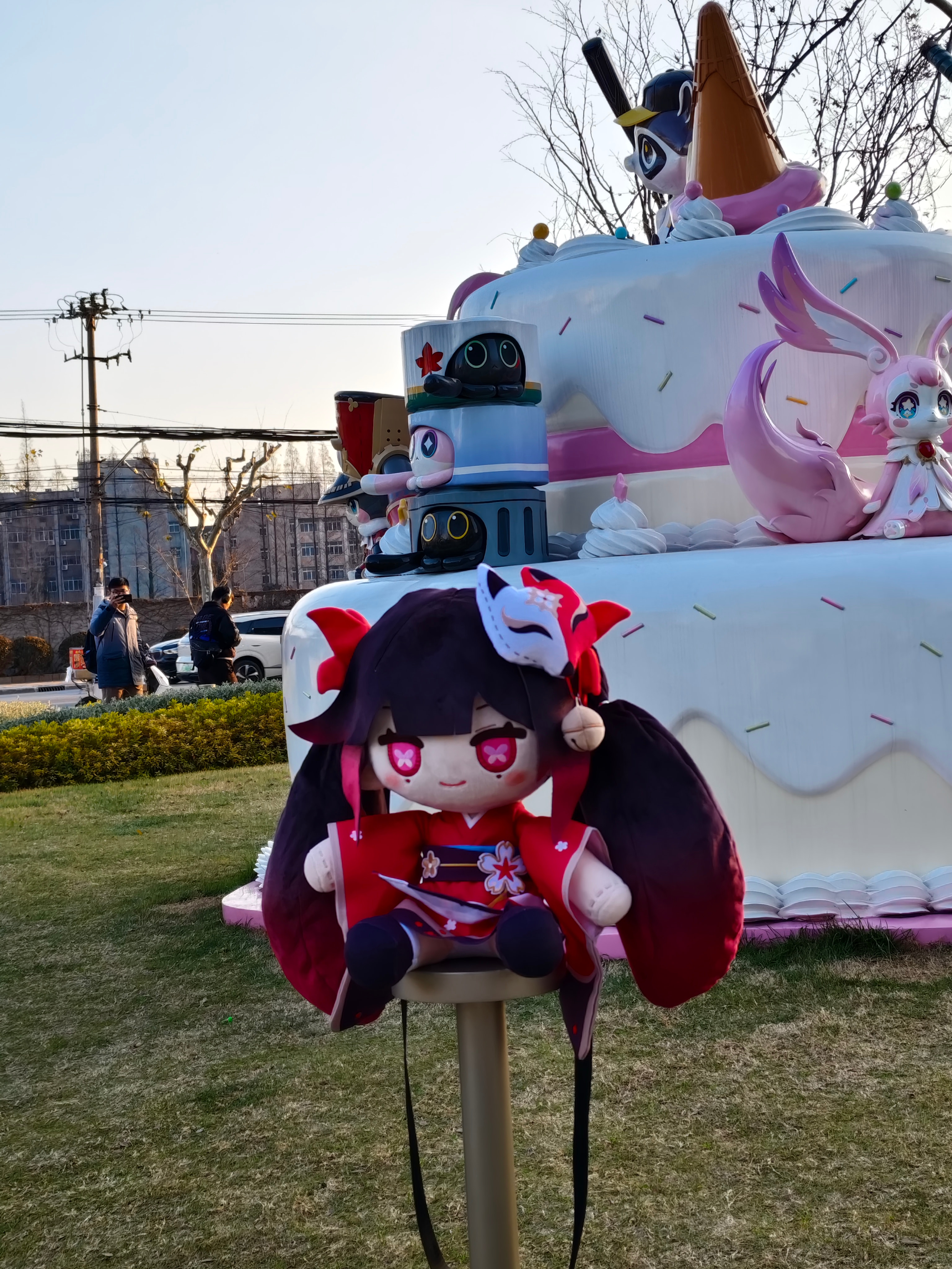随随便便骑了十几分钟很快就到了地方。在那里看到了萨姆的,死龙玻吕刻斯的还有其他同样是铁道的吉祥物的模型。期间有一搭没一搭的跟其他也来到这里打卡的旅行者、开拓者们聊了一些东西顺便拍拍照跟等一下之前星穹铁道演唱会时候认识的跟在米游论坛认识的人线下见面。