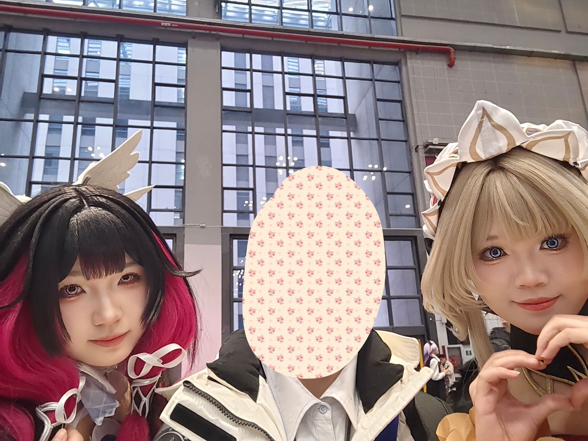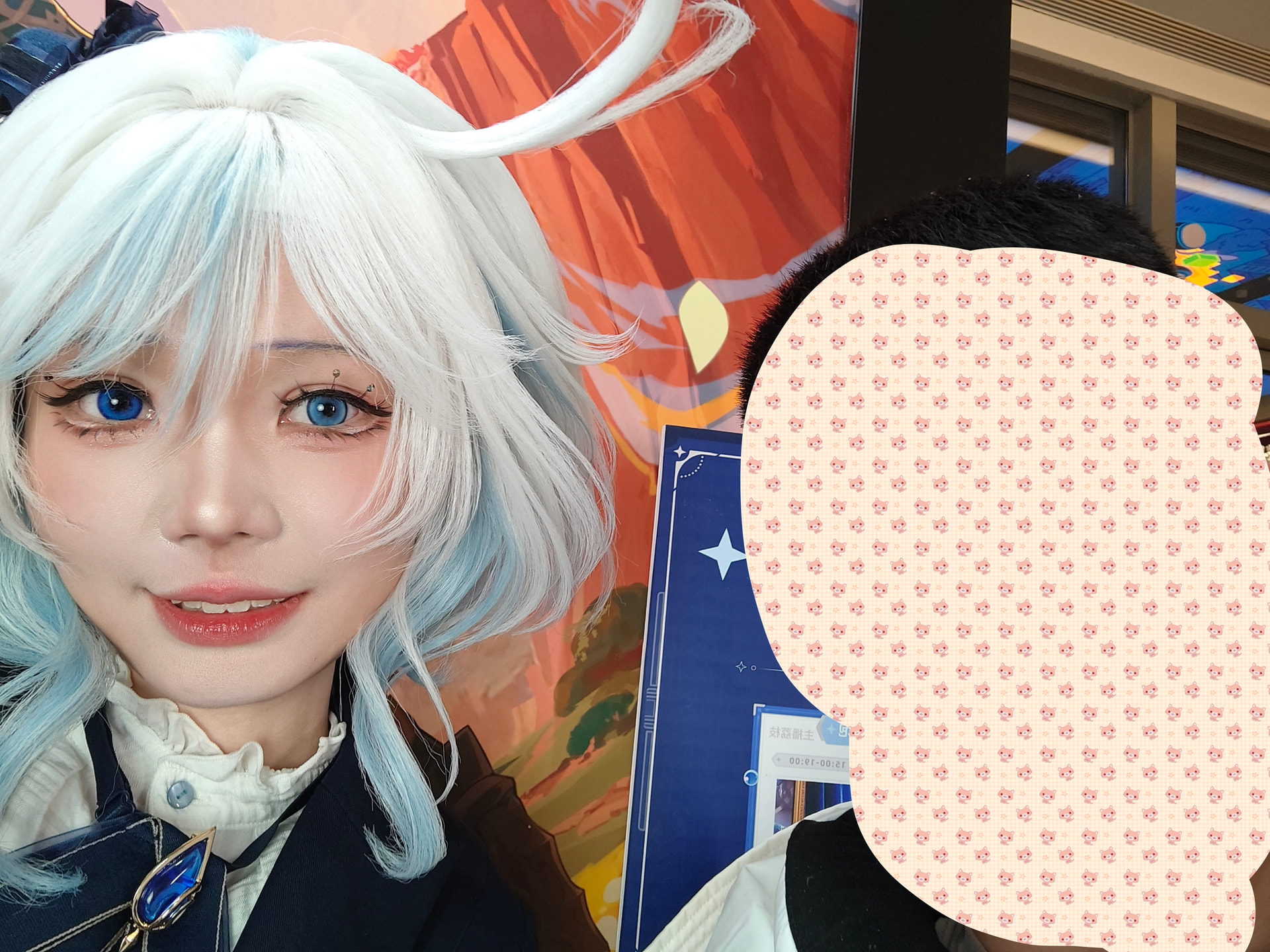 四个人凑到了一起继续排队。终于要到了尽头了,最后才发现原来是一日店长的cos集邮拍摄以及一些小互动。嗨呀,我说怎么需要排这么久的队原来是这么一回事呢。轮到我的时候,很正常的合了个影(也可以说是集邮)。拍完以后其中一位同行的揶揄我说害羞耳朵都红了。这话就不对了嗷。室内空调辣么热,想不红都难啊。怎么能这么说我呢?