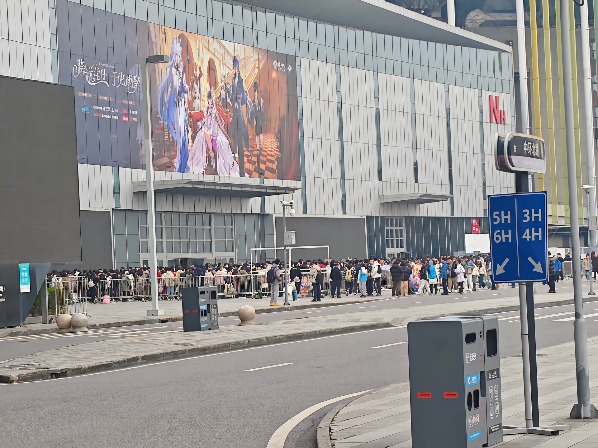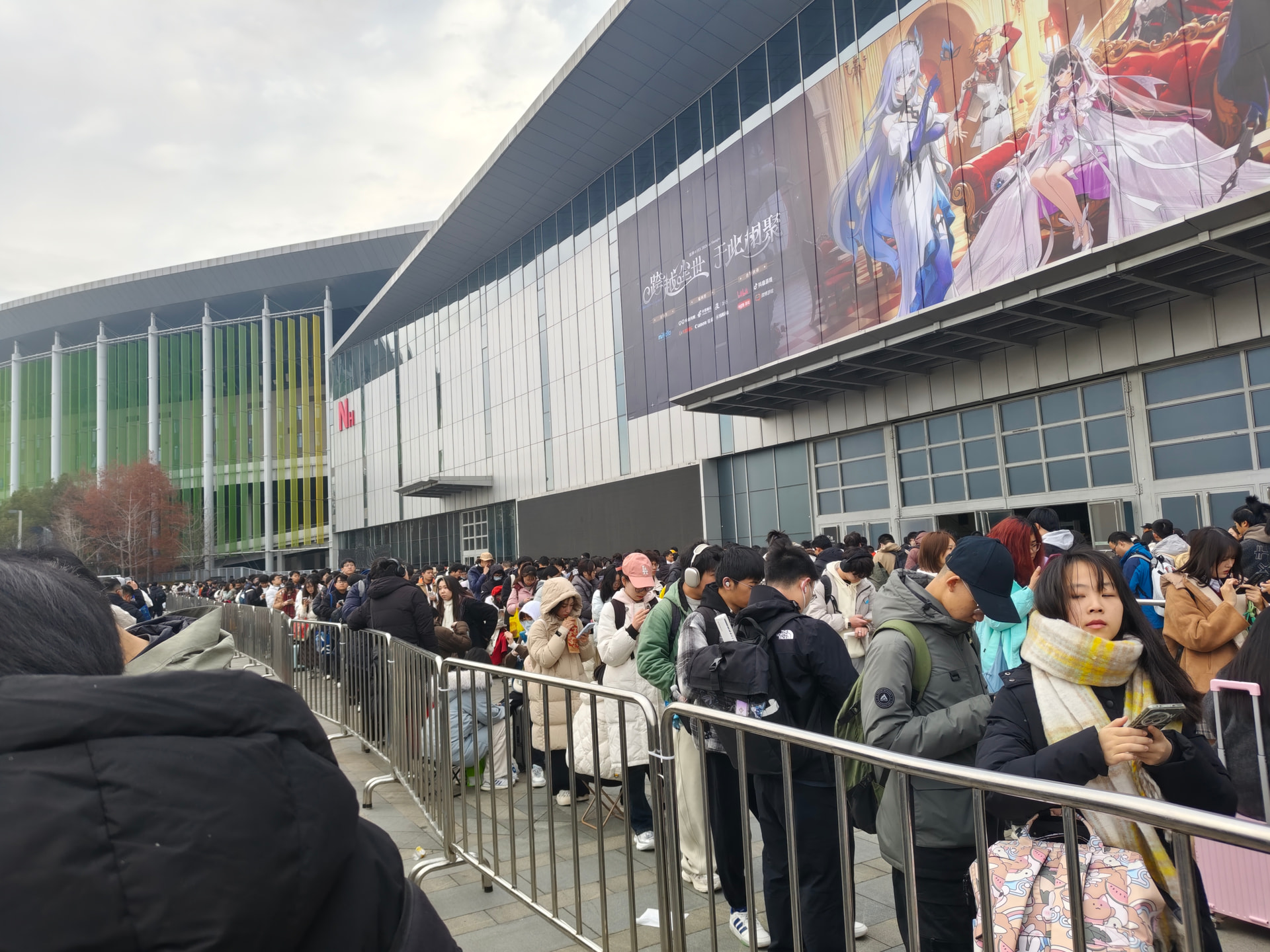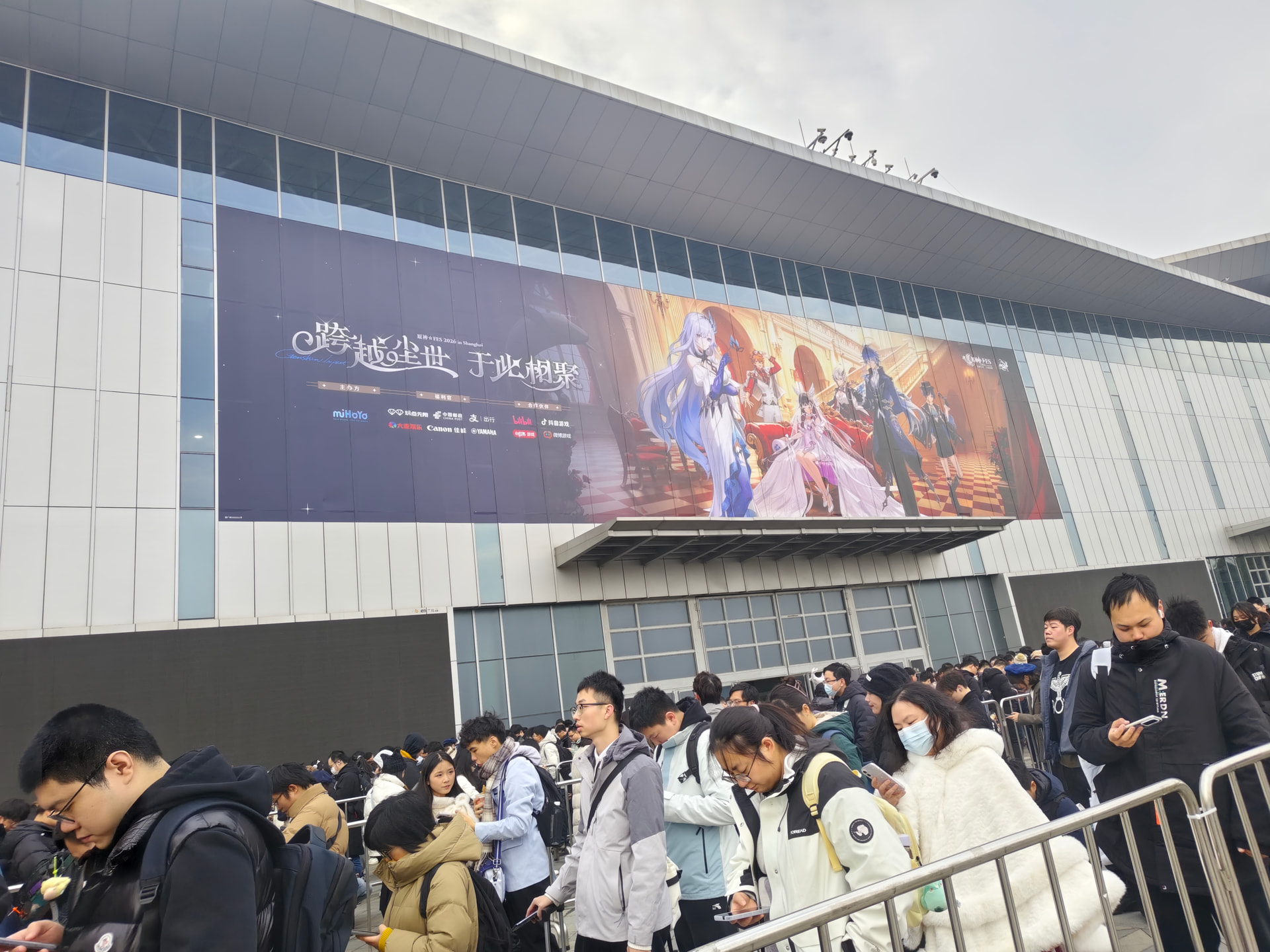 退完房卡然后跟小伙伴一起出发去了会展中心,前一天吃了一亏后,在今天总算学乖了。往另一个方向走了过去。还没走到目的地的时候我感觉24年fes的记忆都回来了。果然还是得这条近一些的路呢。还没走到的时候就看到了外面已经排了长长的一个大队伍。都是抢到普票的人呢,什么?原来我也是普票啊。那没事了。当我们还在排队吹冷风的时候优先票的旅行者们早就进去开始排队抢官方谷子了。