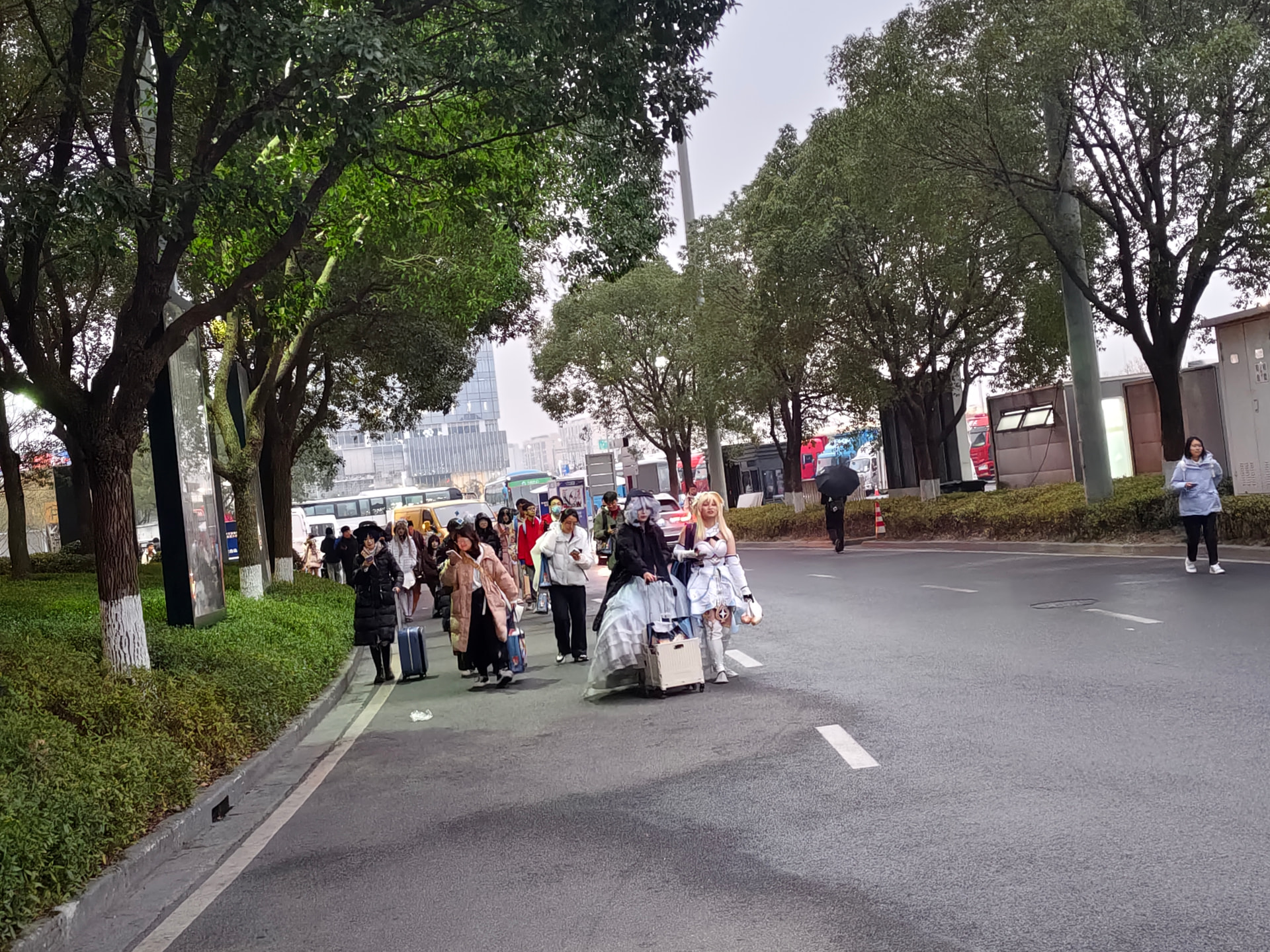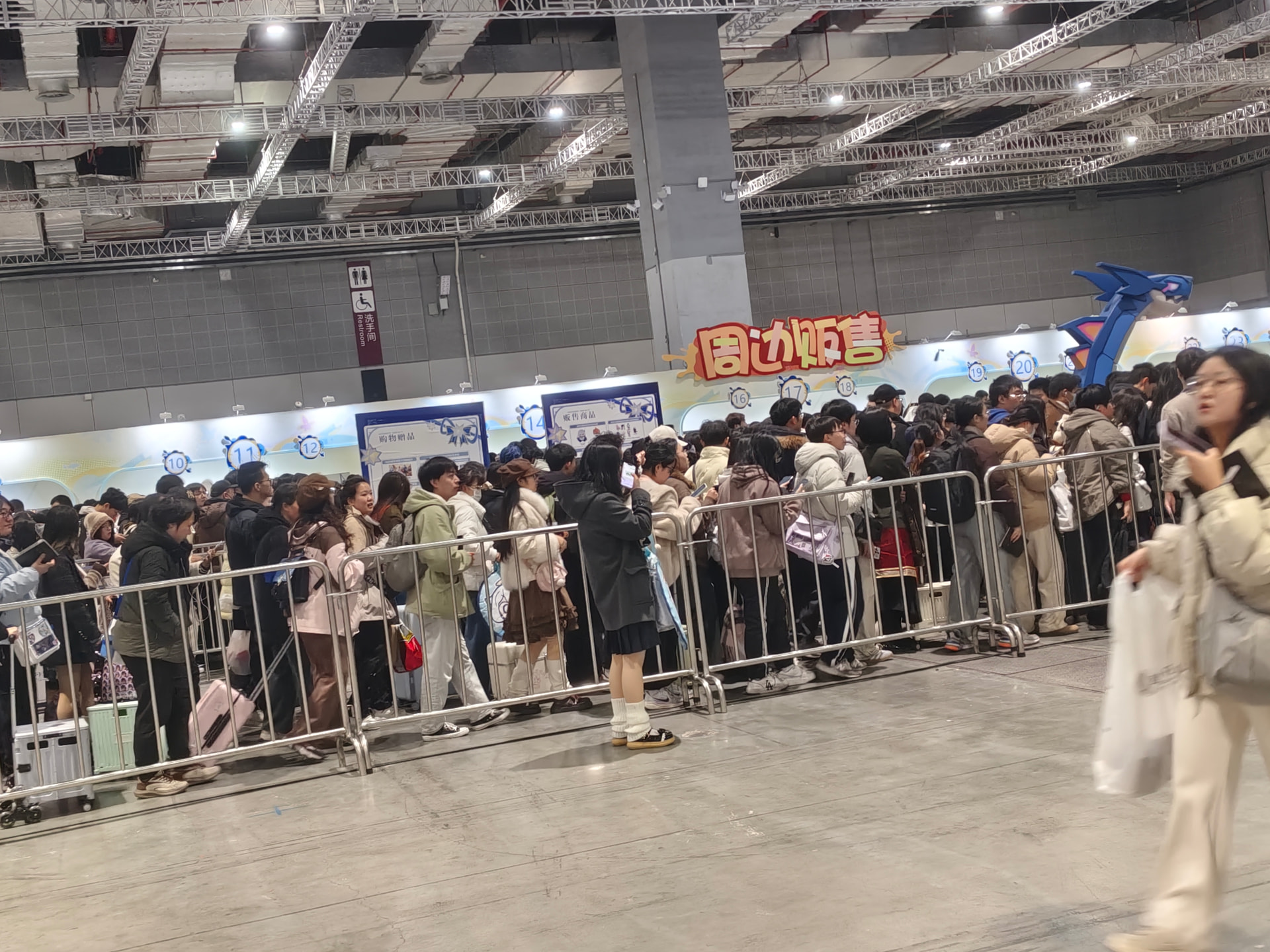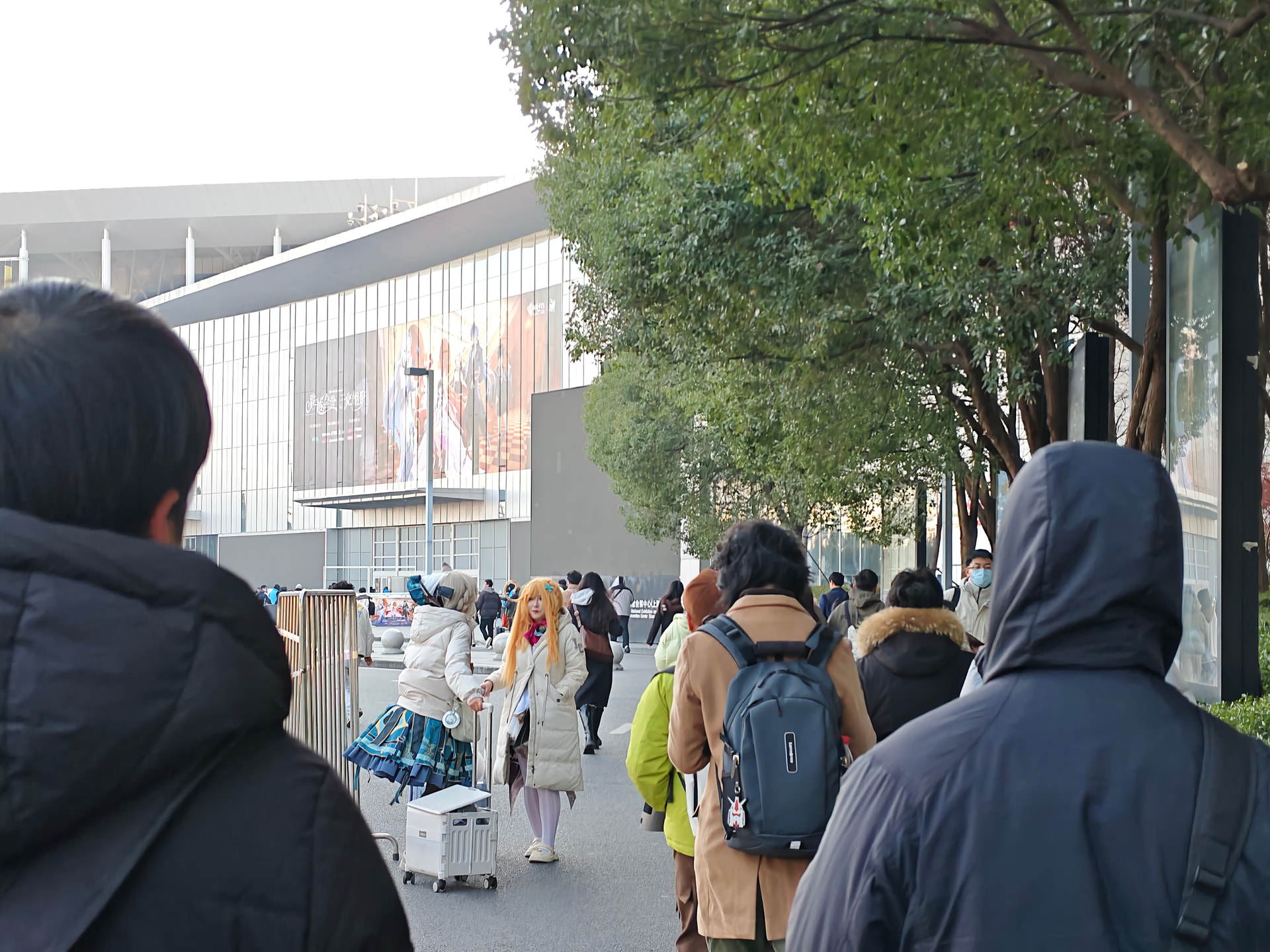 退完房卡然后跟小伙伴一起出发去了会展中心,前一天吃了一亏后,在今天总算学乖了。往另一个方向走了过去。还没走到目的地的时候我感觉24年fes的记忆都回来了。果然还是得这条近一些的路呢。还没走到的时候就看到了外面已经排了长长的一个大队伍。都是抢到普票的人呢,什么?原来我也是普票啊。那没事了。当我们还在排队吹冷风的时候优先票的旅行者们早就进去开始排队抢官方谷子了。