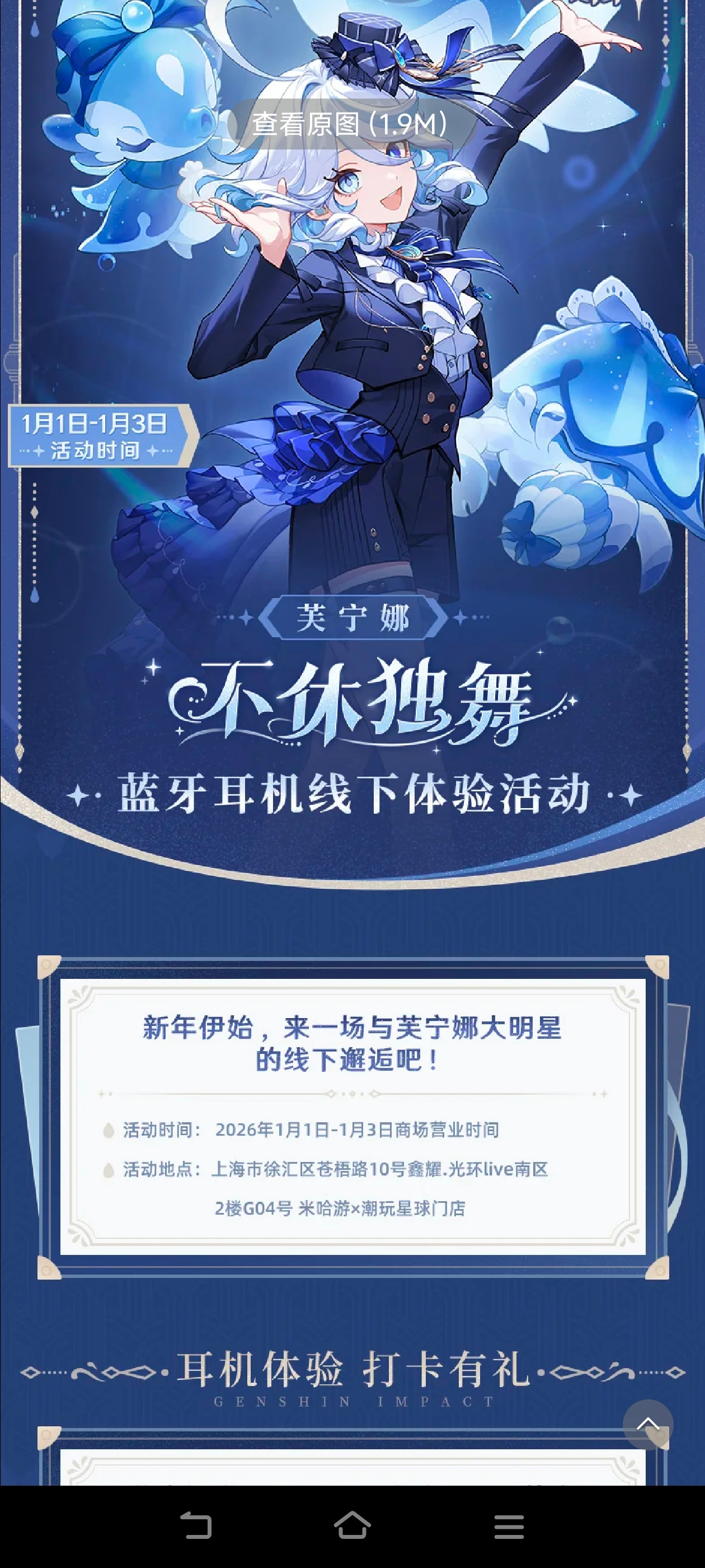 接到电话后,我赶忙跑了过去,把自己的充电宝借过去用了。旁边站着个参加完原神fes的人同时也是借充电宝的好心兄弟。没有什么前因也无后果。大家伙就这么的熟络起来了,毕竟都是米游的爱好者。所以也能很轻松的走到了一起,因为外边太冷也因为附近刚好有原神芙宁娜耳机的相关活动。这期间我顺便预约了一下米哈游公司的参观预约,赶上了最后的小尾巴。最后大家决定先进大楼看看是个怎样的情况。